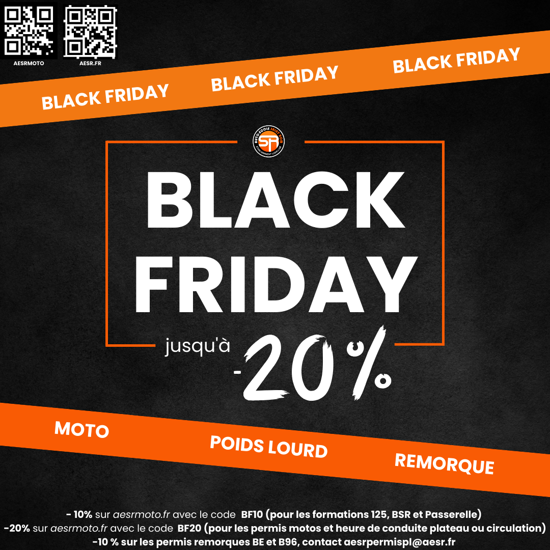 - 10% sur aesrmoto.fr avec le code BF10 (pour les formations 125, BSR et Passerelle)